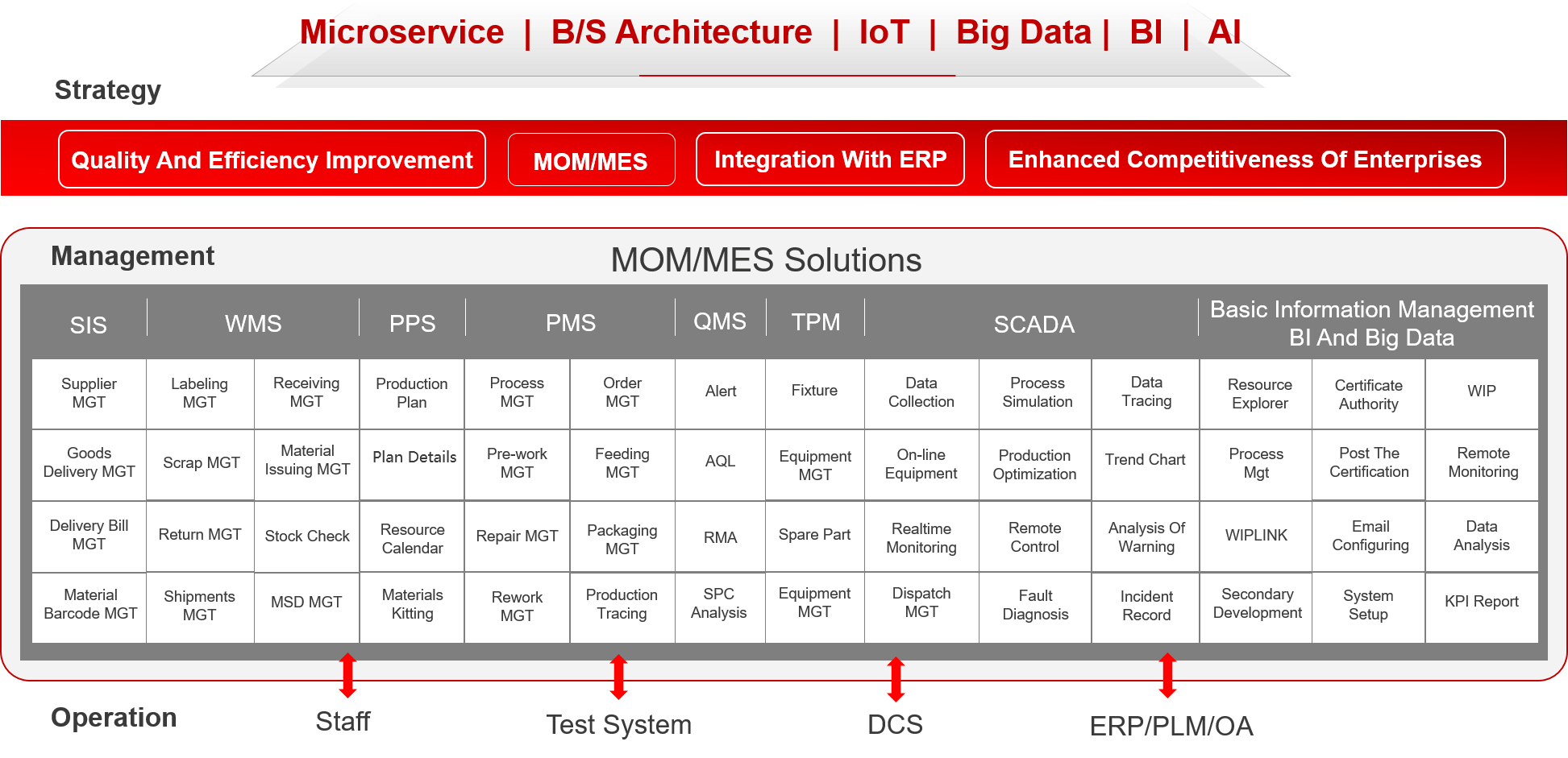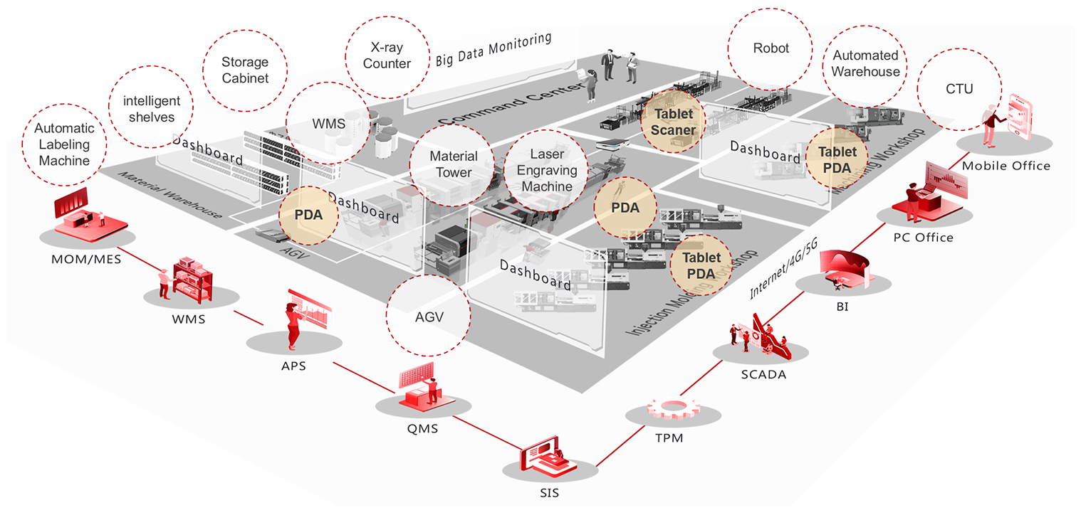 MES integrates with intelligent shelves, AGV, automated warehouses, robots, intelligent production equipment and intelligent vision to provide a smart factory solution for factories.