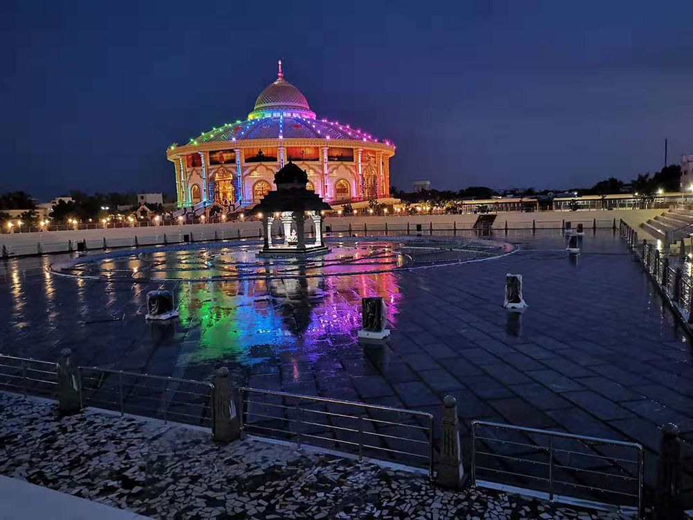蓮花噴泉是由當地自愿者集資籌建,建成后將免費提供給當地各界人士參觀游覽。該項目由一個直徑36米圓形組成,所有設備均采用不銹鋼材質,共計四組水型,蓮花花瓣由496組粗壯跑泉噴頭組成。該項目使用長沙喜馬拉雅音樂噴泉自主研發的DMX噴泉控制系統,通過DMX512協議控制大功率LED水下燈,對每盞跑泉燈光、每個顏色的單點控制,實現燈光跑動、閃爍、無極變色等效果,達到聲、電、光三位一體的表演效果。