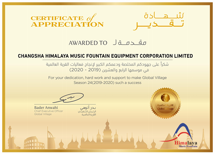 湖南噴泉廠家長沙喜馬拉雅音樂噴泉公司成立十年來,一直秉承客戶至上的理念,答客戶之所疑,解客戶之所困,以最優質的服務回報客戶。日前,我公司收到了一份來自海外的感謝信,感謝公司連續六年來給迪拜地球村公園給予的大力支持和鼎力協助,這一封感謝信充分肯定了我公司在海外市場極高的企業信譽和過硬的工程質量。
