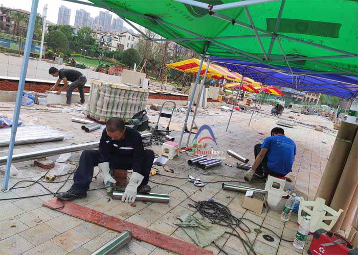 由湖南噴泉廠家長沙喜馬拉雅音樂噴泉公司設計、生產的中央商業小鎮廣場噴泉,已正式進場安裝。