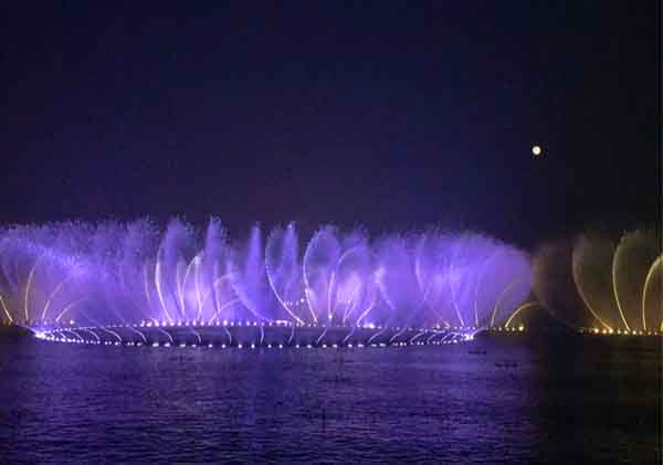 蘇州金雞湖音樂噴泉設計突破性的融合各種高科技技術,讓噴泉的水型表演效果更加豐富多彩。她展示宏偉、壯觀的氣勢;展現高科技帶來的新奇刺激;表現歡快、輕松的場景;刻畫柔美、優雅的畫面; 融入“水火相融”的因素。每種水型的整體性強,噴射層次分明,水型分布均衡,變換豐富,與周圍景觀融為一體,充分展示出了各種水形的不同韻味。