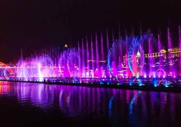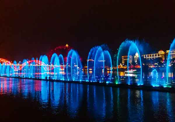 柳州音樂噴泉位于柳州市區柳江大橋與文惠橋之間北岸,處在百里柳江中最經典的一段江面中。上音樂噴泉全長315米,寬40米,設有832套噴頭。噴泉開噴時噴頭浮在江面,噴出的水景高達100米。柳州水上舞臺與水上噴泉交相輝映,造出城市里一道美麗的風景線。柳州音樂噴泉超過排名世界第一的阿拉伯迪拜噴泉和世界第二的美國拉斯維加斯噴泉,是目前世界上江面最大升降浮式噴泉。