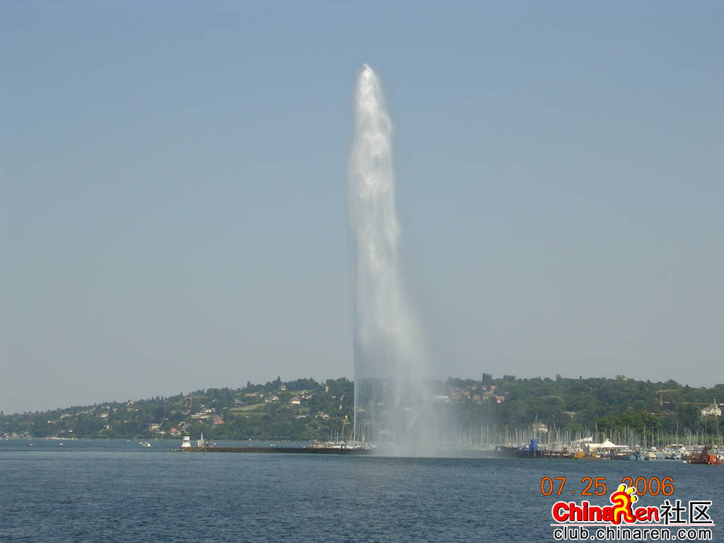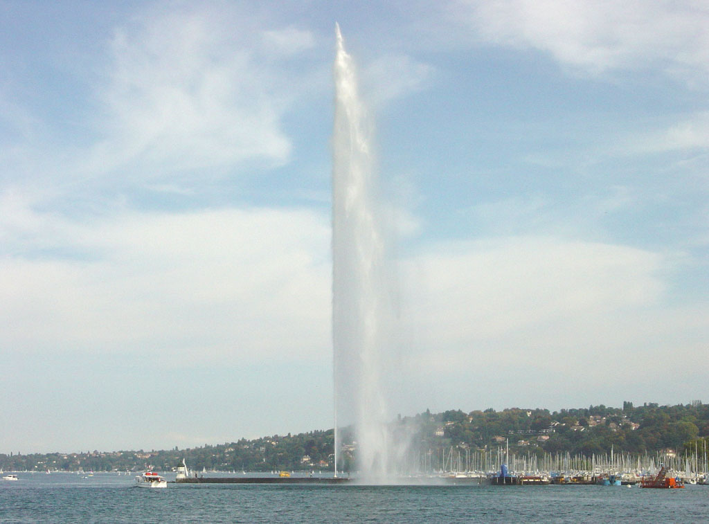 日內瓦湖的大噴泉(Jet d’Eau),每年春天一到,就可以從日內瓦湖上看見一柱擎天的水柱,宛若鯨魚噴出的水柱般,這就是日內瓦蔚為奇觀的大噴泉,大噴泉每次可噴出高有140公尺,500公升噴水量的噴泉,是由130馬力的電力推動為世界上最大的人工噴泉,其壯觀景象,從日內瓦各地都可以望得見,因此,大噴泉也成了日內瓦最具代表性的景觀,也是這個城市的標志。大噴泉位于市中心旁邊的日內瓦湖,沿岸圍繞著絢爛的花園和公園。大噴泉的形成,原是在上世紀末,當地人為了解決發水力發電廠水量過于充沛的現象,而裝置幫浦機抽水,將水抽出發電廠,久而久之,竟成了世界奇觀,更成為觀光勝地,這也是當初人們所始料未及的吧,如今大噴泉于每年三月初到十月的第一個禮拜天為止,除了陰雨天之外,每天都準時做“噴水表演”,供民眾參觀。