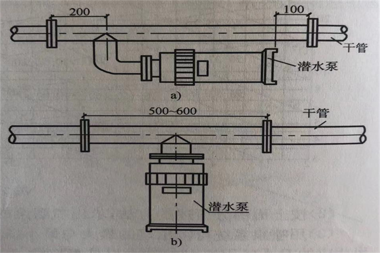 泵軸與干管中心線需垂直,為了減小水池的整體深度,可在泵位處局部加深。為了水泵的檢修、更換、安裝水泵處兩法蘭之間需保持足夠的間距。潛水泵的安裝方式及兩法蘭之間的間距要求見下圖。