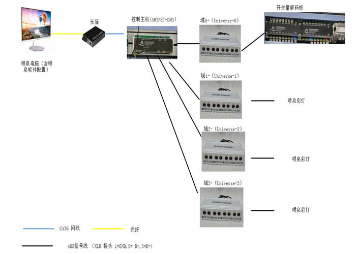 噴泉主機是噴泉控制的“大腦”本身就是一臺潛入式系統的工控機; 接收噴泉軟件的控制指令,轉換成DMX指令給下層單片機。(工作原理如下圖)