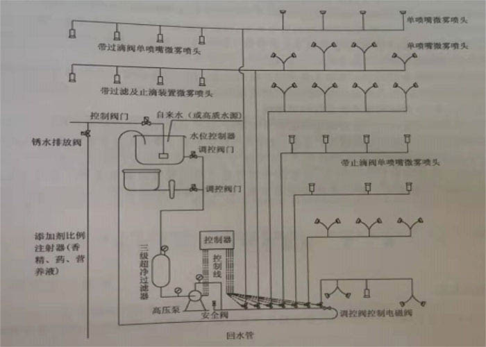 當前霧灌是景觀噴灌和營造噴灌的景觀效果的最為重要的一種灌溉形式。它既可以達到灌溉的效果,又起到美化環境,凈化空氣的作用。