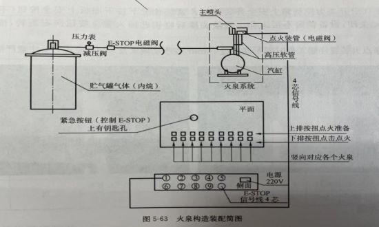 (1)將火噴泉系統,氣罐,E-STOP閥門,減壓閥門連接起來的管路一般采用無縫鋼管,連接完成之后必須進行試壓以保證安全。尤其要注意連接到火噴泉系統的管路尺寸,采用內徑25管,其余部分可根據現場情況,適當小一些無礙。