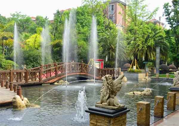一般的小區噴泉的水面清澈而平靜,可將水榭、山石、花草等映入水中形成倒影,可增加景物的層次和美感。在設計造型的時候,一般加入雪松噴泉、多分支噴泉等小型噴水設備,讓水面若有細微漣漪,可使倒影更加生動活潑、多姿多彩。這種小型噴泉結構簡單,造價低廉,水量和能量消耗少,運行費用低,無噪音,維護管理簡單,所以實際應用較多。
