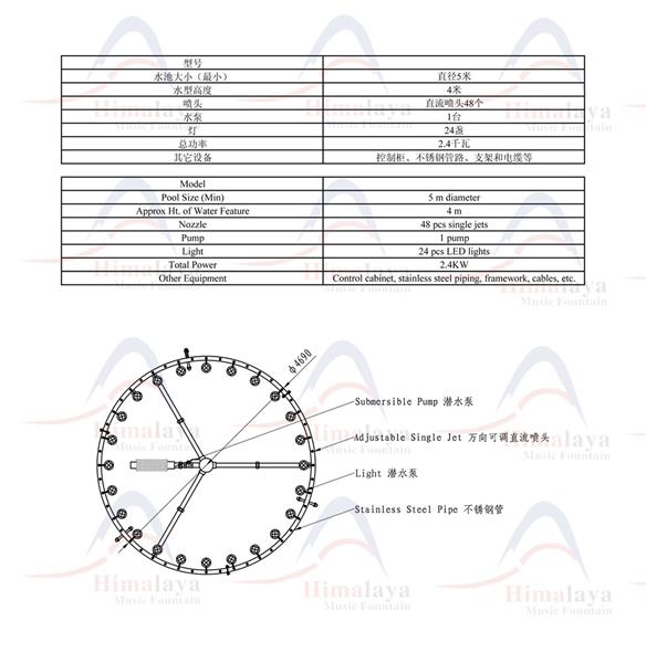長沙喜馬拉雅音樂噴泉公司制作設計的小型噴泉,水池直徑建議最小為5米圓形直徑,5米直徑的圓形水池按比例配置48個DN25萬向直流噴頭。噴頭可以根據水池大小進行增減,每兩個噴頭搭配一盞LED水下彩燈,或者每個噴頭配一盞LED水下彩燈。