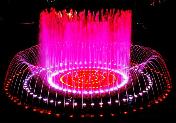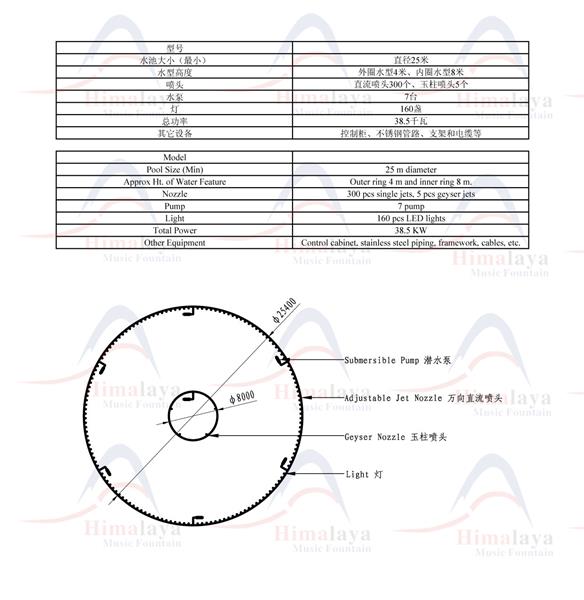 25米直徑噴泉外圈配置300個DN25直流噴頭,噴頭可以萬向角度的調節,噴水的方向和形態可以根據音樂或燈光效果的需要進行靈活手動變化。內圈水型部分,安裝了5個以上DN25玉柱噴頭,這些噴頭可以產生高達8米的粗壯噴水效果,為噴泉增添了獨特的視覺效果。