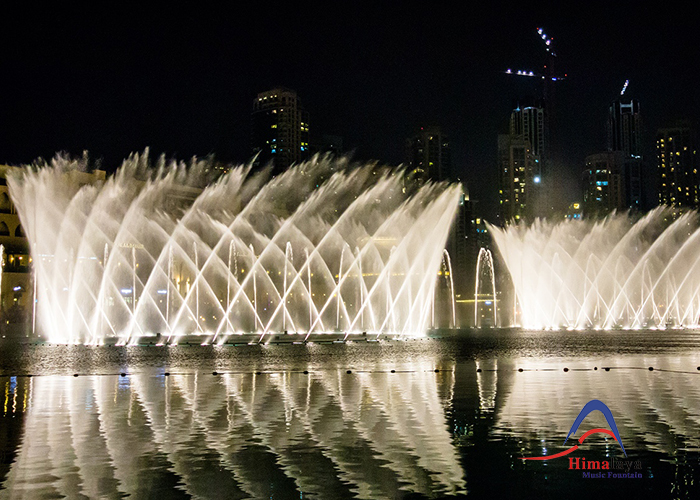 迪拜噴泉所用的燈光和Bellagio Fountain一樣主要為白色水燈。另外,迪拜噴泉用了25臺彩色投射機,以5個一組安裝在5個圓形里。