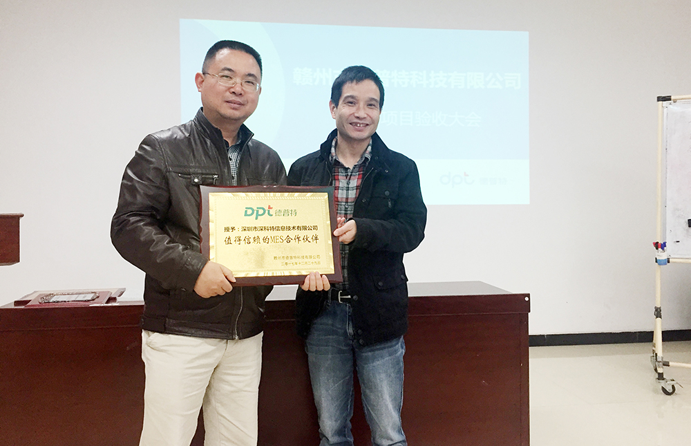 ? ? ? ?經過為期半年的努力,深科特和贛州德普特雙方高度配合,MES系統在2017年12月底順利結案,2018年1月3日,在贛州德普特工廠,召開了MES系統項目結案會議,深科特MES系統在生產車間和倉庫范圍實現了物料管理、生產管理、品質管理、數據追溯、數據接口管控等功能,贛州德普特邁出了智能制造堅實的一步。