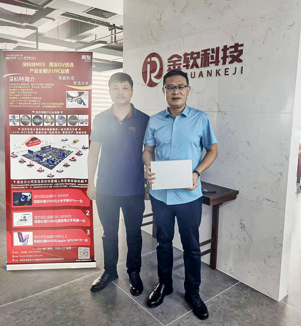 ? ? ? ?近日,用友伙伴淄博金軟(全稱:淄博金軟信息科技有限公司)與深科特(全稱:深圳市深科特信息技術有限公司)成功簽約山東強茂MES項目,開創了三方合作的新篇章!此前,深科特推出了用友及伙伴營銷人員的簽單獎勵機制,此項目簽約金額符合第1獎勵政策,故深科特為用友伙伴淄博金軟王總準備了一份達標超值獎勵!