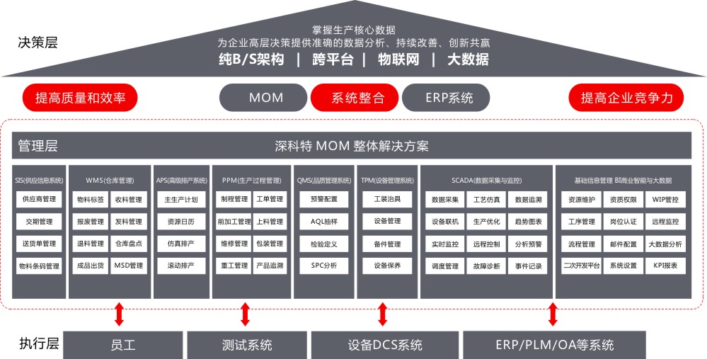 當今的制造商都在使用MES 或 MOM,通過在整個價值鏈中實現業務流程績效的自動化、執行和管理來實現運營轉型。借助 MOM技術,您可以實現供應鏈運營的端到端集成、全面的產品可跟蹤性、實時生產管理和全球標準化制造流程。憑借對制造流程的了解,深科特MOM解決方案使企業能夠提升其卓越運營,不僅為自己還能為客戶創造更大的價值。